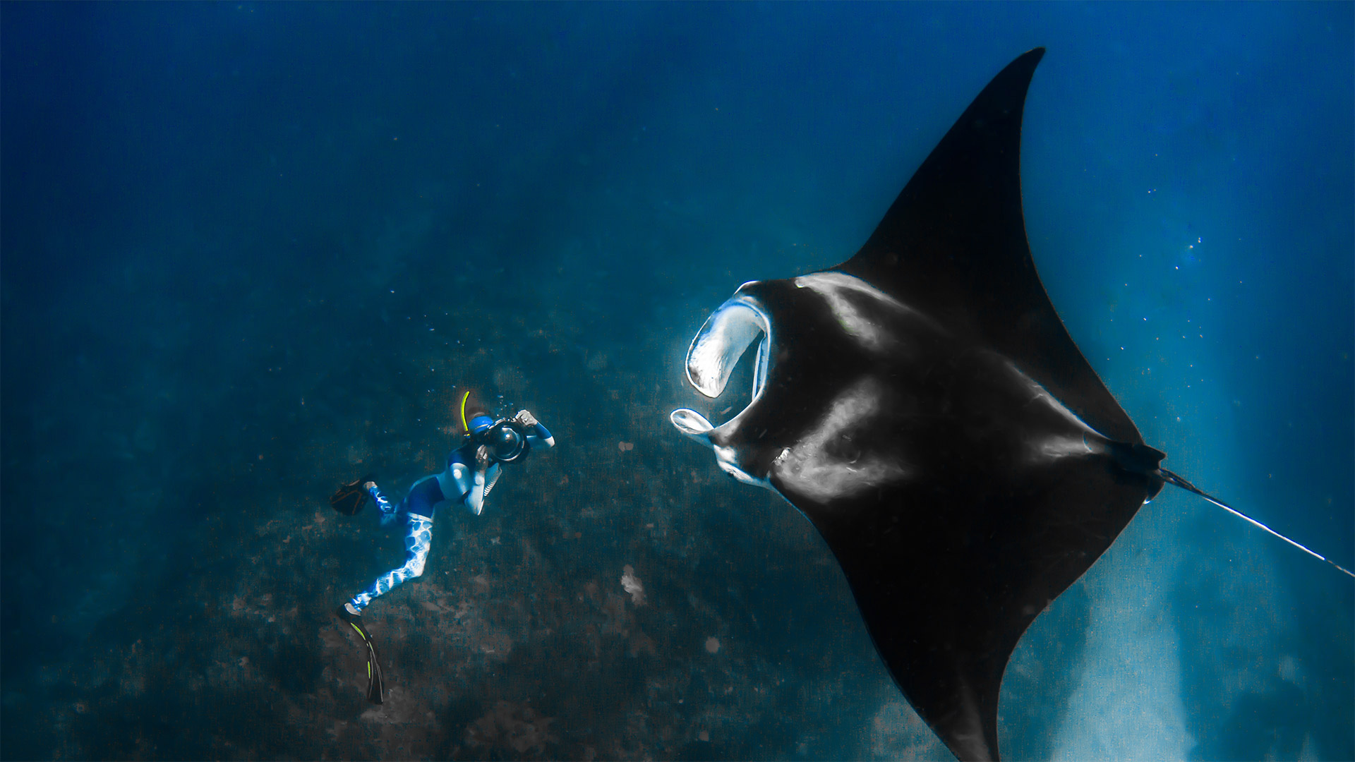Giant manta ray and a photographer off the Ningaloo Coast, 澳大利亚 (© Shutterstock Premier)